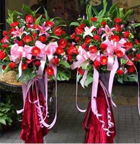 公司开业用的开业花篮,红玫瑰,黄玫瑰,红色扶郎,粉色百合,凤尾叶
