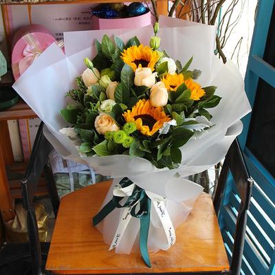 19朵粉红色康乃馨,满天星、黄莺点缀,内衬白色软纱,外用粉红色裙边皱纹纸双层圆形包装,粉红色蝴蝶结丝带束扎。花语含义:亲爱的妈妈,这十几年来您辛苦了!希望在这特别的日子送上我特别的问候!祝:母亲节快乐!妈妈我永远爱您!
