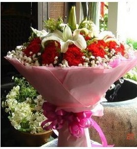 19朵粉红色康乃馨,满天星、黄莺点缀,内衬白色软纱,外用粉红色裙边皱纹纸双层圆形包装,粉红色蝴蝶结丝带束扎。花语含义:亲爱的妈妈,这十几年来您辛苦了!希望在这特别的日子送上我特别的问候!祝:母亲节快乐!妈妈我永远爱您!