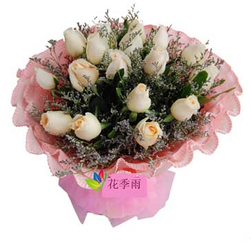 花材简介:18朵香槟玫瑰,情人草点缀,浅粉色卷边皱纹纸双层圆形包装,粉红色棉纸蝴蝶结点缀。