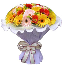 各6朵红和粉色扶郎花,黄色扶郎6朵,紫色手柔纸包装。