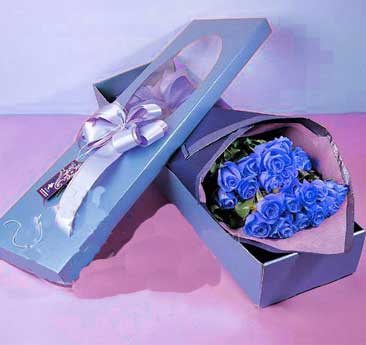 22朵蓝色妖姬礼盒花,分成两个11朵两排放置,选适当绿叶点缀,蓝色绵纸包装,再装进带有蓝色蝴蝶结的蓝色礼盒内,尽显示其典雅,和不同一般的个性。
