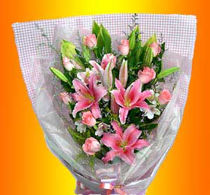 2枝粉百合10朵粉玫瑰,各种绿叶点缀,高档包装纸包装。