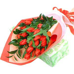 19枝郁金香绵纸包装,绿叶,红色和桔红色绵纸包装,白色外围一层。 郁金香季节在每年的12月份到次年5月份